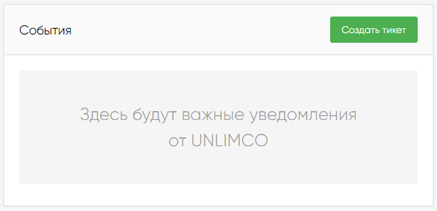 В блоке отображаются наиболее важные актуальные уведомления для мерчанта от технической поддержки Unlimco. В правой части блока расположена кнопка «Создать тикет».