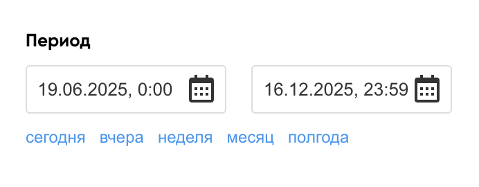 Период Для выбора начальной и конечной даты периода нажмите на значок календаря в соответствующей графе. Для быстрой установки диапазона дат вы можете воспользоваться кнопками «сегодня», «вчера», «неделя» и т. д. По умолчанию в календаре выбраны последние семь суток. |