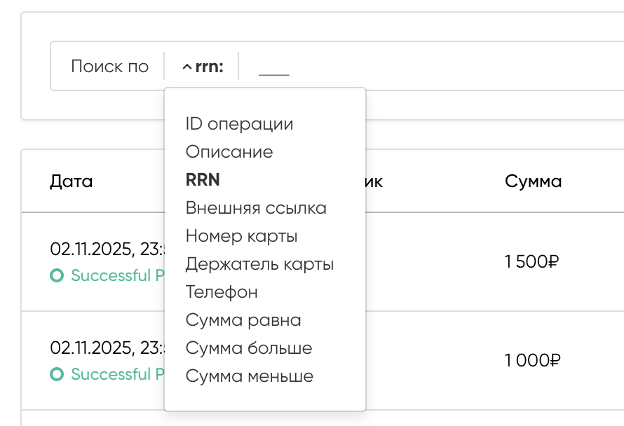 «Искать по» из выпадающего списка и нажмите клавишу Enter. Под строкой поиска отобразится список транзакций, соответствующих критериям поиска.