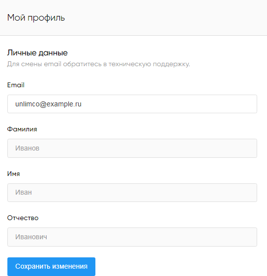 Для внесения изменений в профиль пользователя выполните необходимые изменения в поля формы «Личные данные» и нажмите «Сохранить изменения». Для отмены сделанных изменений закройте страницу без сохранения.