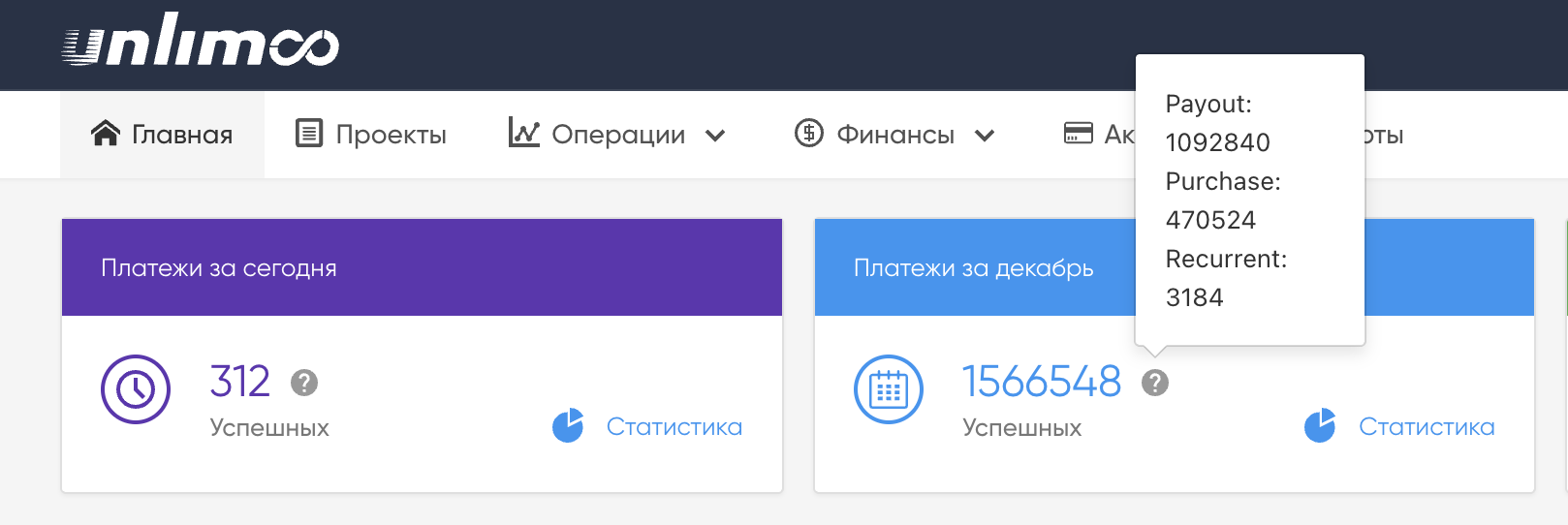 В блоках «Платежи за сегодня» и «Платежи за месяц» отображается общее число успешных операций за соответствующий период по всем проектам. При наведении указателя на иконку с вопросительным знаком отобразится информация о количестве операций каждого типа.